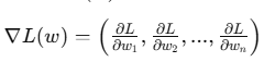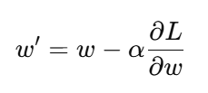 경사 하강법에서는 손실 함수 L(w)의 기울기(미분)를 계산하여, 기울기의 반대 방향으로 가중치를 업데이트합니다. 이를 수식으로 표현하면 다음과 같습니다.