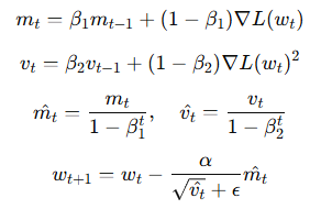 · 𝛽1,𝛽2 : 각각 1차, 2차 모멘트의 이동 평균 계수 (일반적으로 0.9, 0.999로 설정)