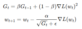 Adagrad의 단점(학습률이 점점 작아지는 문제, Vanishing Learning Rate)을 해결하기 위해, 기울기의 누적을 지수 이동 평균(EMA, Exponential Moving Average)으로 계산하여 업데이트하는 방식입니다.
