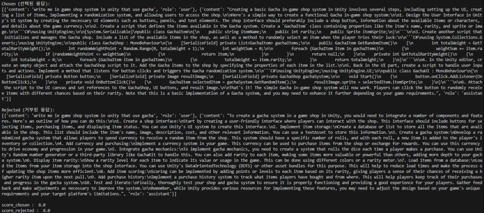 즉, 인간이 보기에 더 좋고 적절한 응답을 'chosen'으로, 덜 좋거나 부적절한 응답을 'rejected'로 표시한 것입니다.