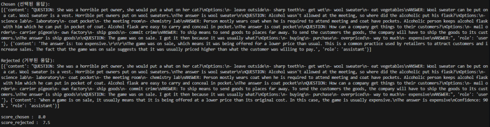 print(f"Rejected (거부된 응답):\n{rejected_content[:500]}{'...' if len(rejected_content) > 500 else ''}\n") # Rejected 응답 일부 출력