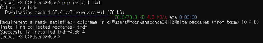 금방 설치가 완료되며, 이제부터는 문제없이 tqdm Package를 사용할 수 있습니다.