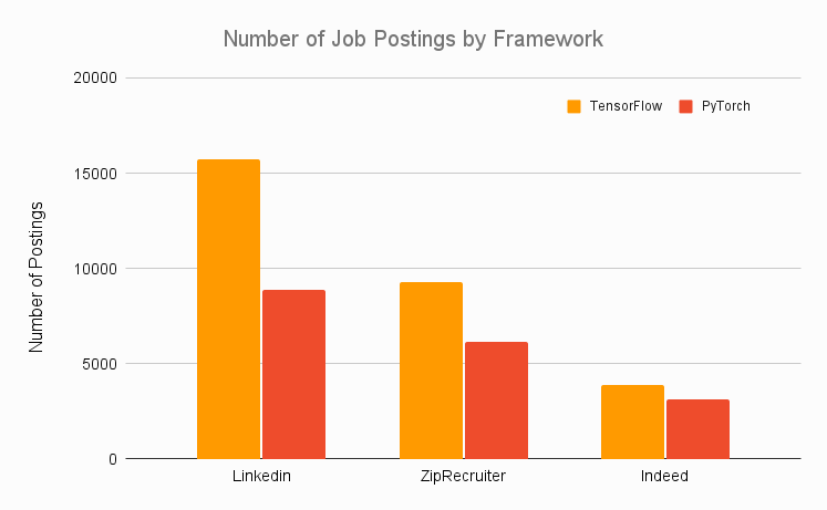 아래 그래프의 각 Framework에 대해 다양한 직업 WebSite의 채용 공고 수를 집계했으며 TensorFlow가 PyTorch를 크게 압도했습니다.