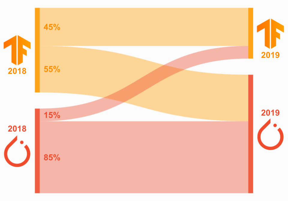 이 Data는 아래 Sankey Diagram에 시각화되어 있으며 왼쪽은 2018년, 오른쪽은 2019년에 해당합니다. Data는 총 수가 아닌 2018년 각 Framework의 사용자 비율을 나타냅니다.