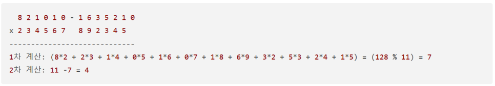 위와 같이 821010-1635210에 대해서 계산을 해보면 마지막 자리는 4가 되어야 함을 알 수 있다. 즉, 821010-1635210은 유효하지 않은 주민등록번호임을 알 수 있다.