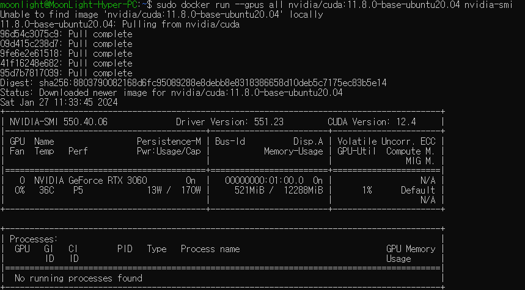 sudo docker run --gpus all nvidia/cuda:11.8.0-base-ubuntu20.04 nvidia-smi