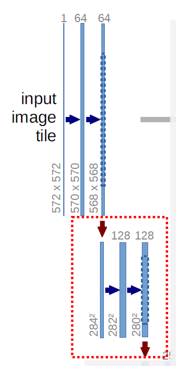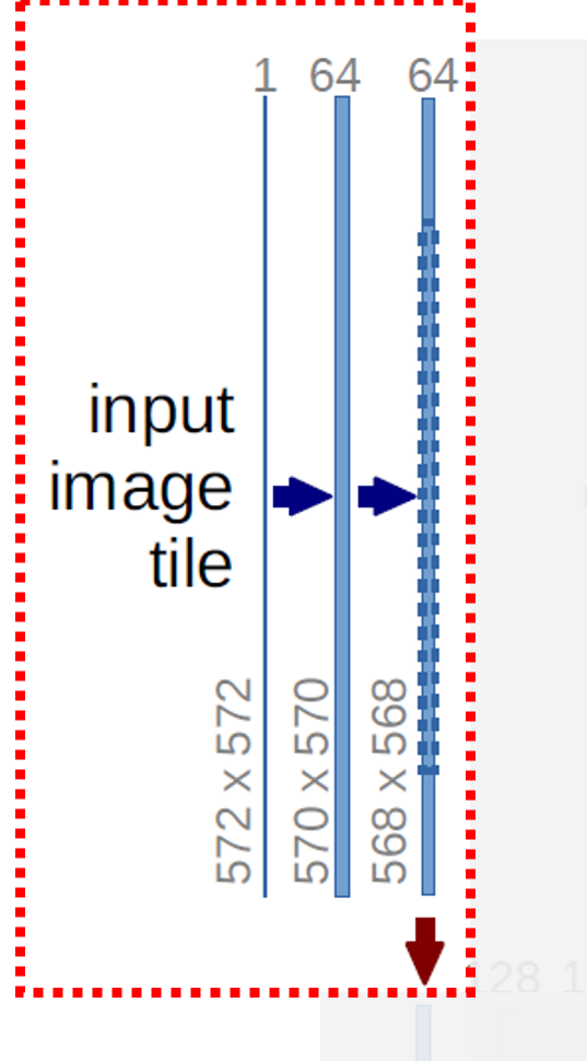 Input Image Size는 572x572입니다. 이 Image를 64개의 3x3 Kernel의 Convolutional Layer를 2번 거쳐서 568x568 Size의 Feature Map 64개를 만듭니다.