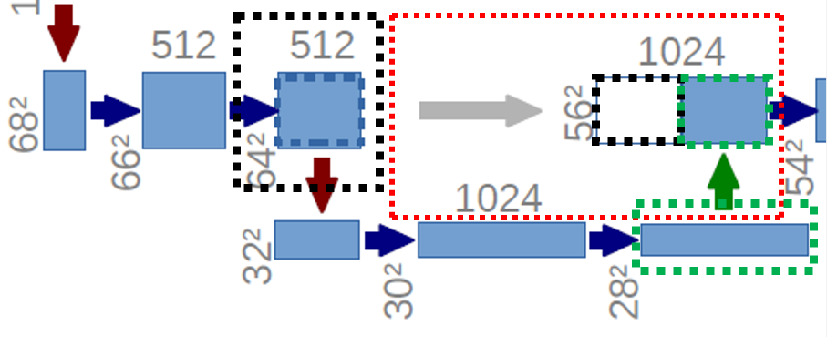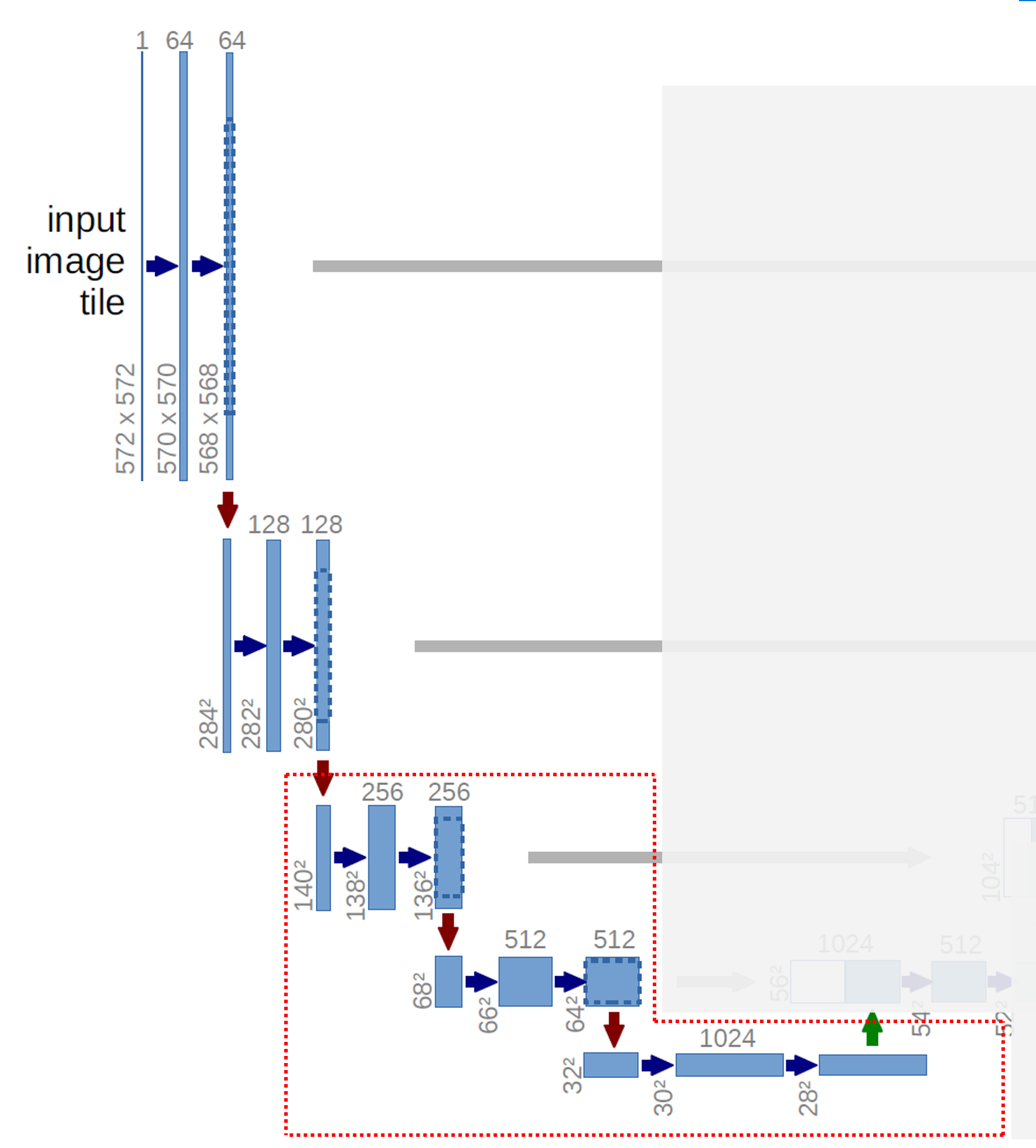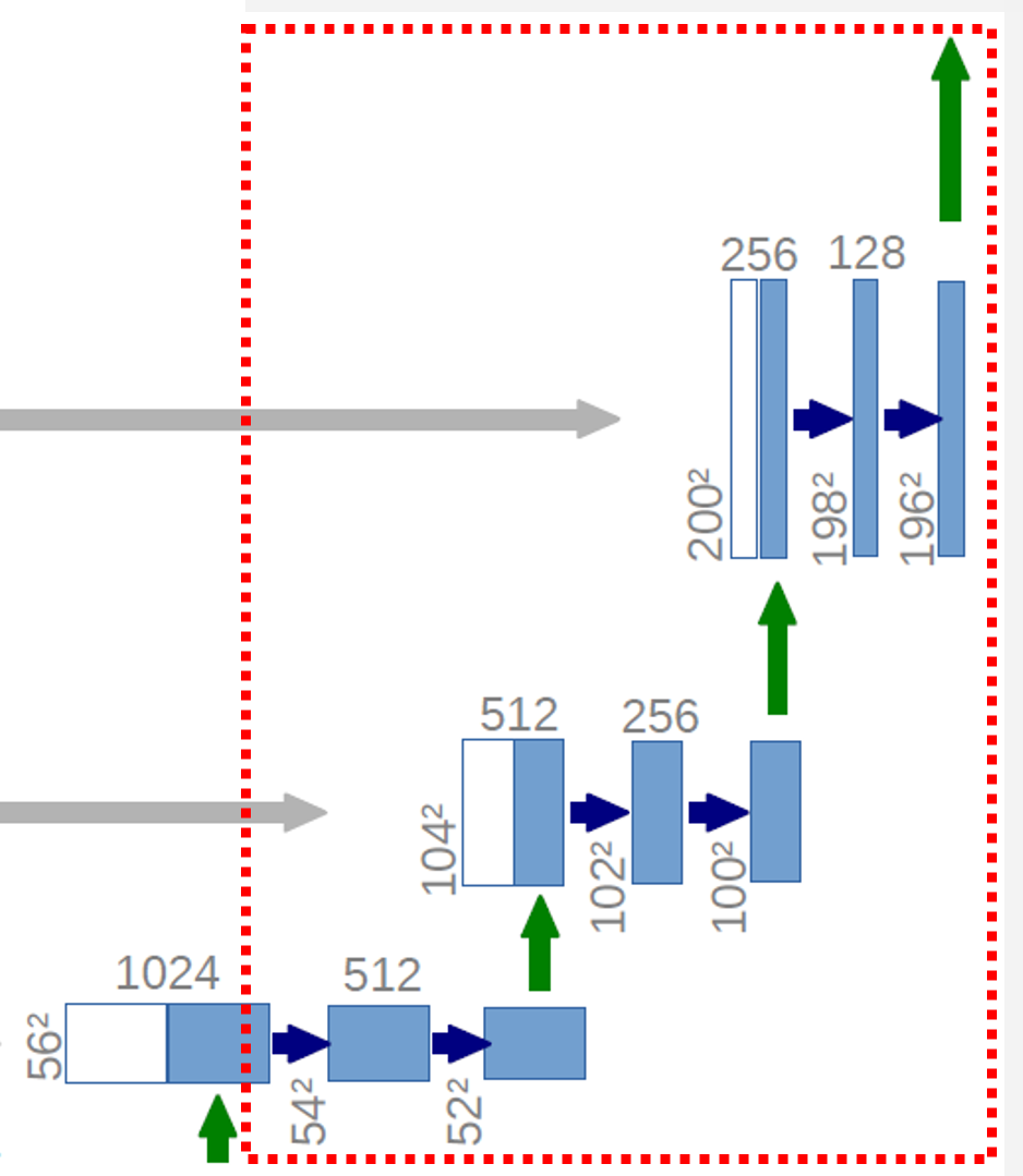 위 그림에서 초록색 점선 부분은 수축 경로에서 최종적으로 생성된 28x28x1024 크기의 Feature Map입니다.