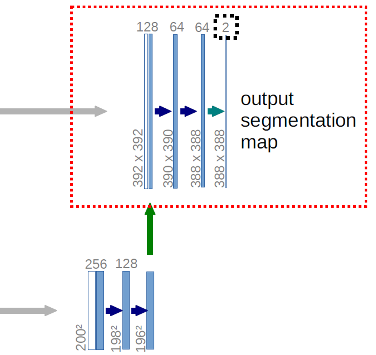 Paper에서 최종 Output Segmentation Map는 388x388x2의 크기를 가지며, Paper에서 예로 든 U-Net Model은 입력 Image에서 2가지를 구분하도록 Train 되었다고 생각할 수 있습니다.
