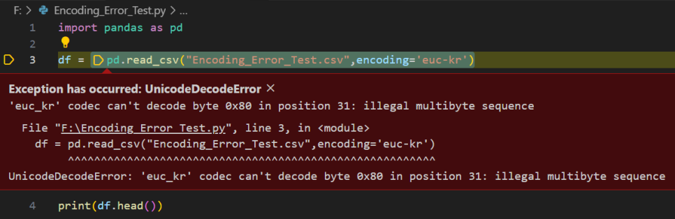 Pandas의 read_csv로 CSV file을 읽거나 혹은 Text 기반의 파일을 python에서 읽으려고 할 때, "UnicodeDecodeError 'utf-8' codec can't decode byte 0x~~ in position ~ invalid start byte"라는 Error를 종종 만나곤 합니다.