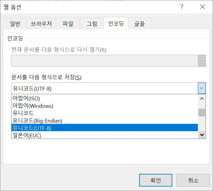 Excel에서는 File 저장시에 Encoding방식을 변경하는 방법은 아래와 같습니다.