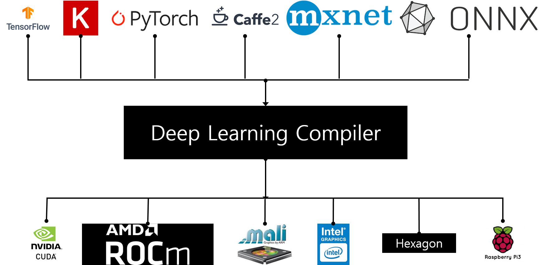 안녕하세요, MoonLight입니다. 오늘은 널리 쓰이고 있는 Deep Learning Compiler 몇 가지를 살펴보도록 하겠습니다. 1. TVM 1.0. Overview TVM은 CPU , GPU 그 외의 다른 Deep Learning Accelerator들에 맞게 Model을 Compile하는 Framework입니다. 다양한 Hardware Backend에 맞게 Model을 최적화하고 효율적으로 계산하도록 만들어 줍니다. 1.1. Conversion & Optimization TVM이 Model을 최적화하고 Machine Code를 생성하는 방법을 소개하도록 하겠습니다. 변환하고자 하는 Tensorflow / PyTorch / Onnx File을 입력 받습니다...