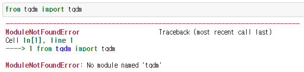안녕하세요, MoonLight입니다.​오늘은 python package중에 하나인 tqdm을 설치하는 방법에 대해서 알아보겠습니다.​tqdm은 진행률을 표시하는데 사용하는 Package인데, 시간이 많이 걸리는 작업이 어느 정도 진행이 되었는지 표시해 주는 용도로 쓰입니다.​주로 for문의 range와 함께 사용되고, 설치되어 있지 않은 경우에는 아래와 같은 Error가 발생합니다.​​​​설치하는 방법은 매우 간단합니다. pip install tqdm​금방 설치가 완료되며, 이제부터는 문제없이 tqdm Package를 사용할 수 있습니다.​감사합니다.